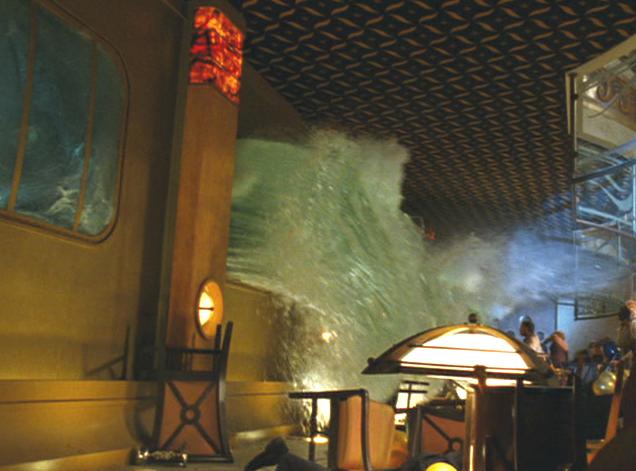 It's a good thing they leave the ballroom when they do. Soon the windows cave under the immense pressure of the water, and everyone inside the ballroom is killed.